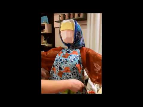 - Еще один кусок ткани повязываем вокруг головы, имитируя платок, его также пришиваем.